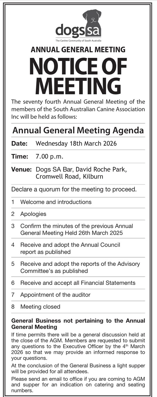 If members are interested in staying for finger food and socialising after the event, please email info@dogssa.com.au for catering numbers.